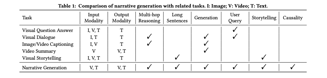본 논문은 하나, 또는 여러개의 long video로부터, Text(텍스트 형태로 생성하되, 필요하면 비디오 요약이나 하이라이트 영상도 생성 가능) 형태의 목표 지향(goal-driven) 서사를 생성하는 컴퓨팅 기반의 서사 생성(computational narrative generation) 문제를 다른다. 특히 서사 생성 문제는 기존 문헌과 다르게 "사용자 목표(User goal), 서사 구조(narrative structure), 오픈 도메인 입력(open-domain input << 모든 도메인에서)에 대한 포괄적인 이해를 핵심으로 삼는다는 점에서 차별성을 가진다.